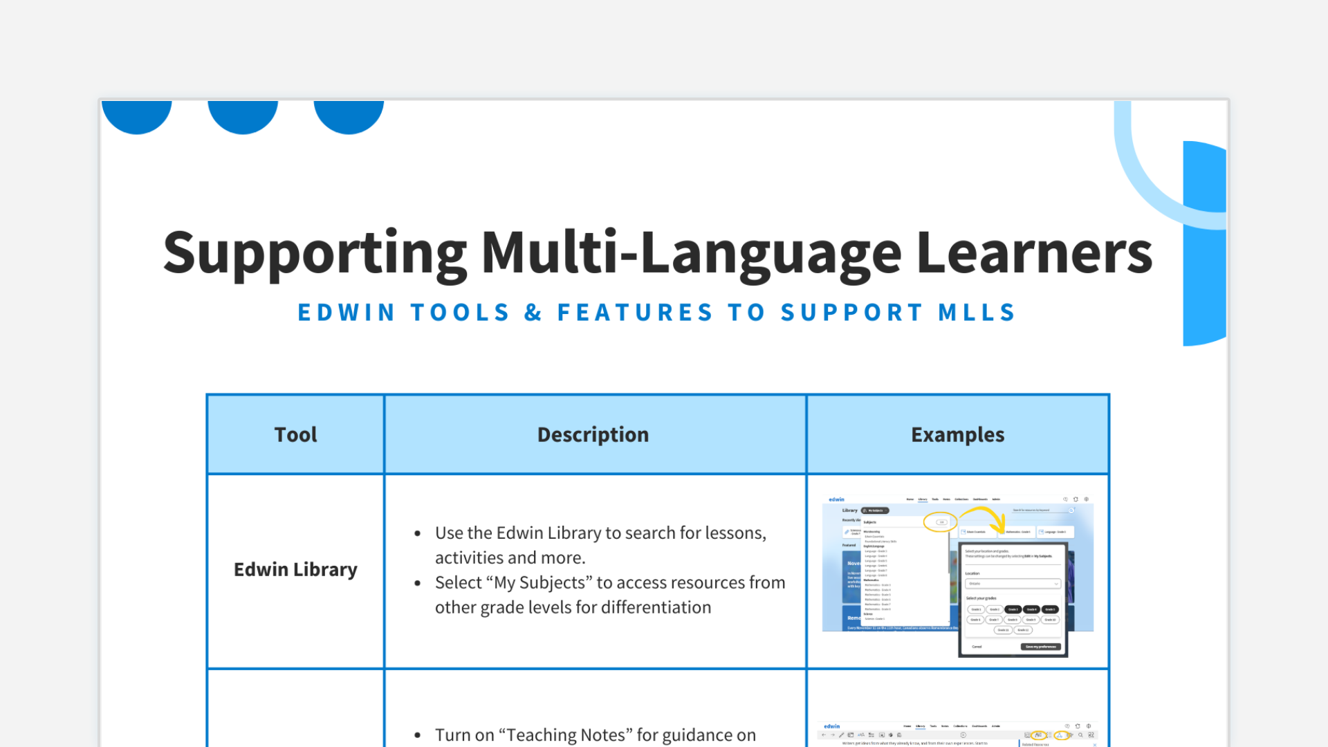 Edwin tools, features, and strategies for supporting mutli-language learners.