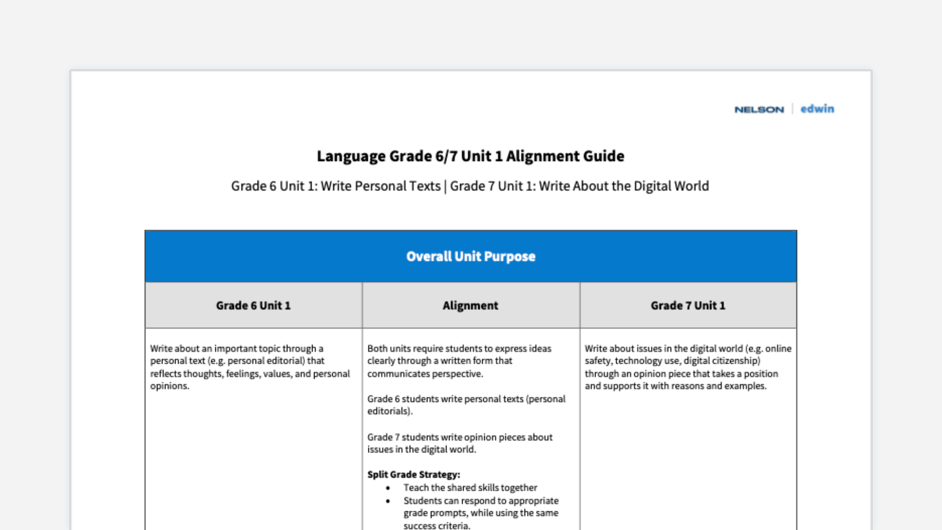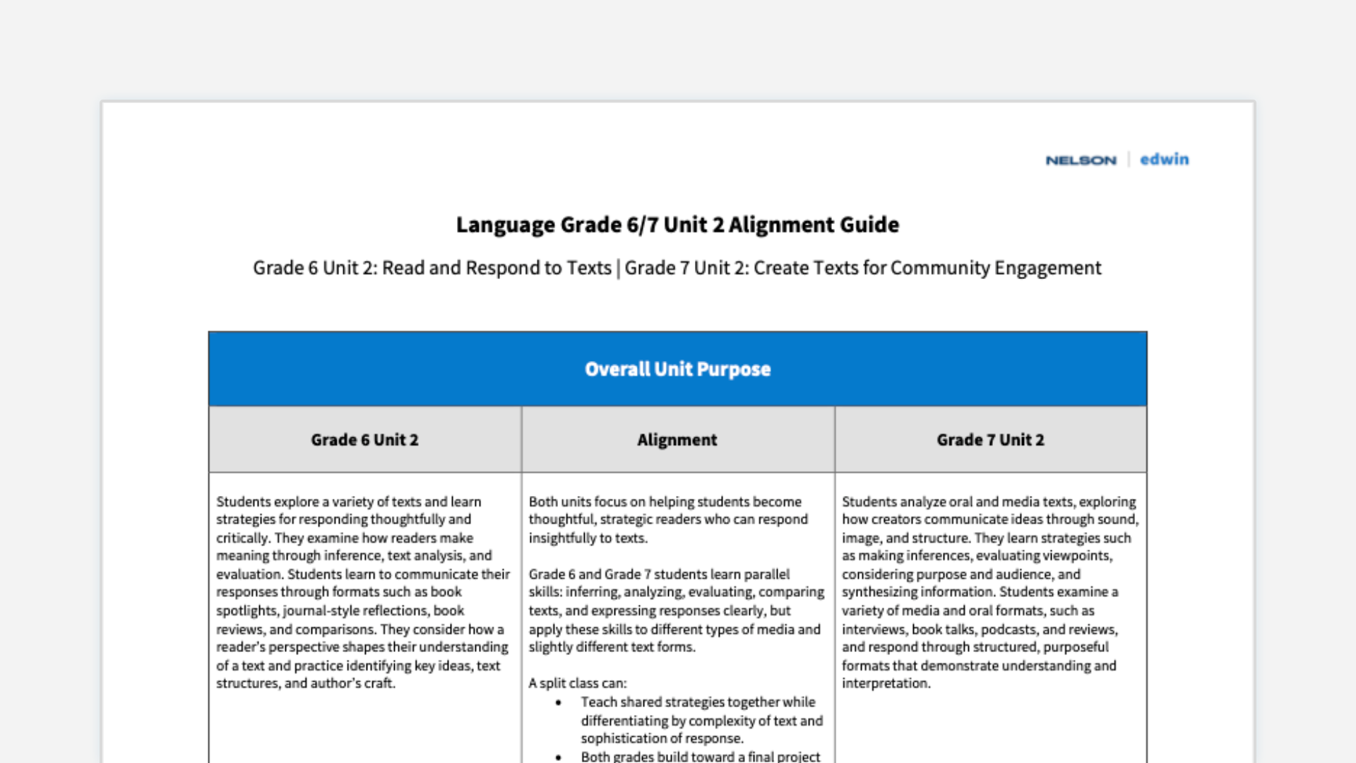 A guide to navigating Edwin content aligned to Grade 6 and 7 Language Arts Unit 2 to support split grade classrooms.